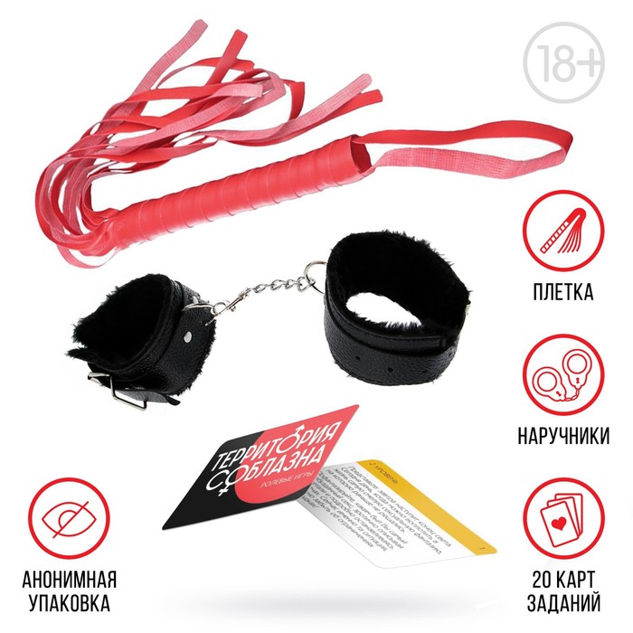 Игра для пар «Территория соблазна», 3 в 1 (20 карт, наручники, плетка), 18+