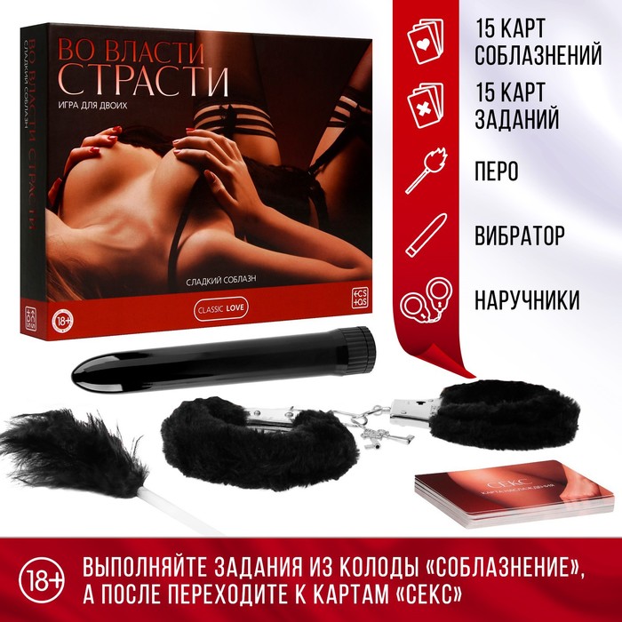 Вибратор в секс игре для пар «Во власти страсти. Сладкий соблазн», 4 в 1 (30 карт, наручники, перо, вибратор), 18+