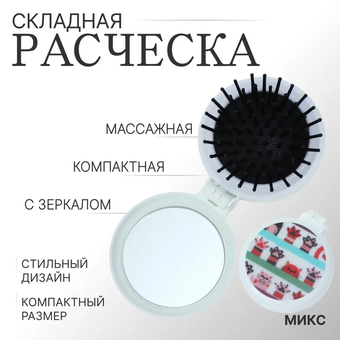 Расчёска массажная, складная, с зеркалом, d = 6 см, цвет МИКС