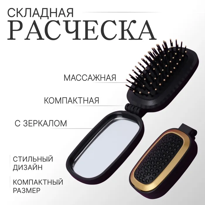 Расчёска массажная, складная, зеркалом, 9.5×5.5 см, чёрная