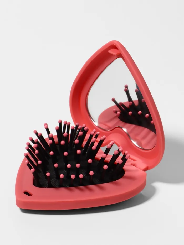 Расчёска массажная «Сердце», складная, с зеркалом, 8×2.5 см, матовая, розовая
