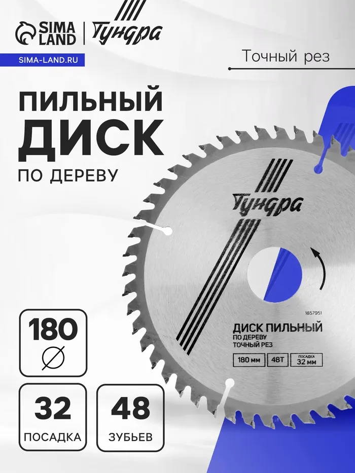 Диск пильный по дереву ТУНДРА, точный рез, 180×32 мм (кольца на 22.20,16), 48 зубьев