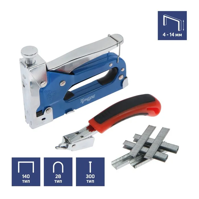 Степлер мебельный ТУНДРА, 3 в 1, металлический корпус, типы скоб 140/28/300, 4 - 14 мм