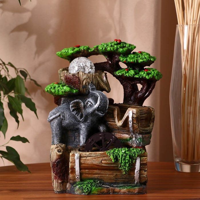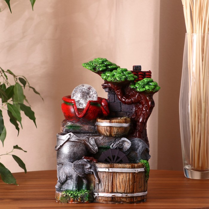Фонтан настольный «Слоники под деревом, бочки и кувшины», 12×15×24 см, с подсветкой