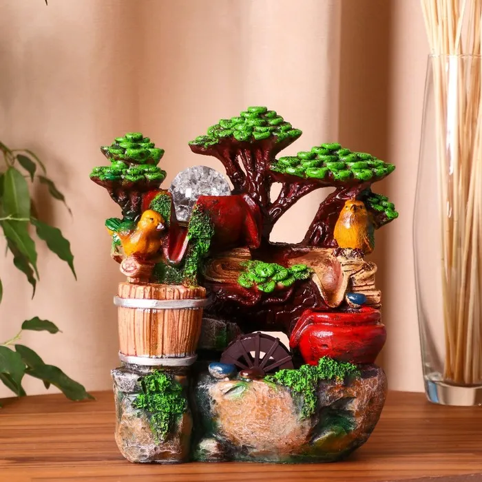 Фонтан настольный «Птички на брёвнышке у мельницы», 12×16×27 см, с подсветкой
