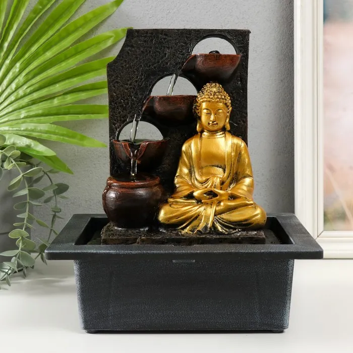 Фонтан настольный от сети, подсветка "Будда в золотом у стены с водопадом" 23х17.5х28 см