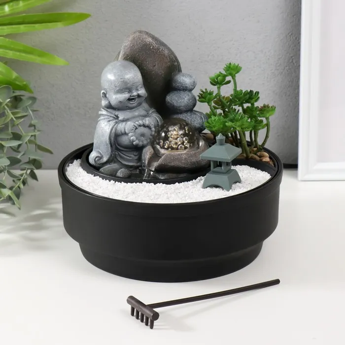 Фонтан настольный, японский сад камней «Маленький хотей в саду Дзен», от сети с подсветкой, 21×21×21 см