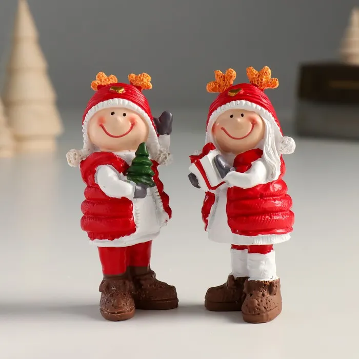 Фигурка полистоун «Малыш в красном стёганном жилете и шапке с рожками», 4×4×9.5 см, МИКС