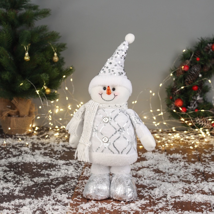 Мягкая игрушка "Снеговик блеск" (59х21 см выдвинутые ножки) 40х21 см, серебристо-белый