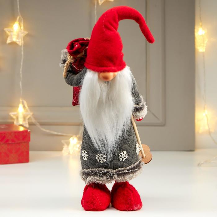 Интерьерная текстильная кукла «Дедушка Мороз с мешком подарков и лыжными палками», 40×14×16 см