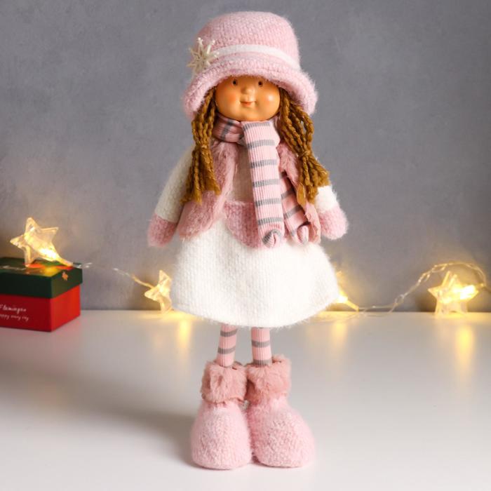 Интерьерная кукла текстильная «Малышка с хвостиками, в вязаном бело-розовом наряде и шляпке», 36.5 см
