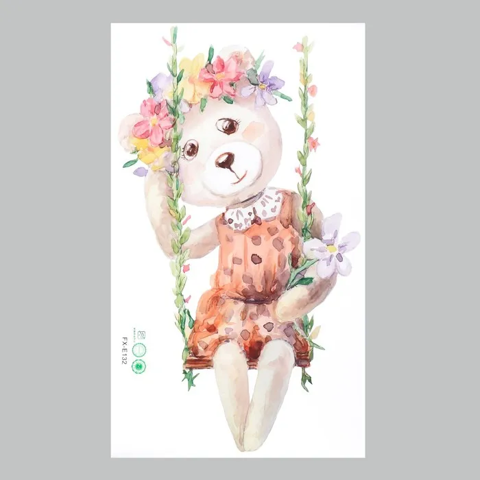 Наклейка пластик интерьерная цветная "Ретро. Медведица на качелях с цветами" 35х60 см