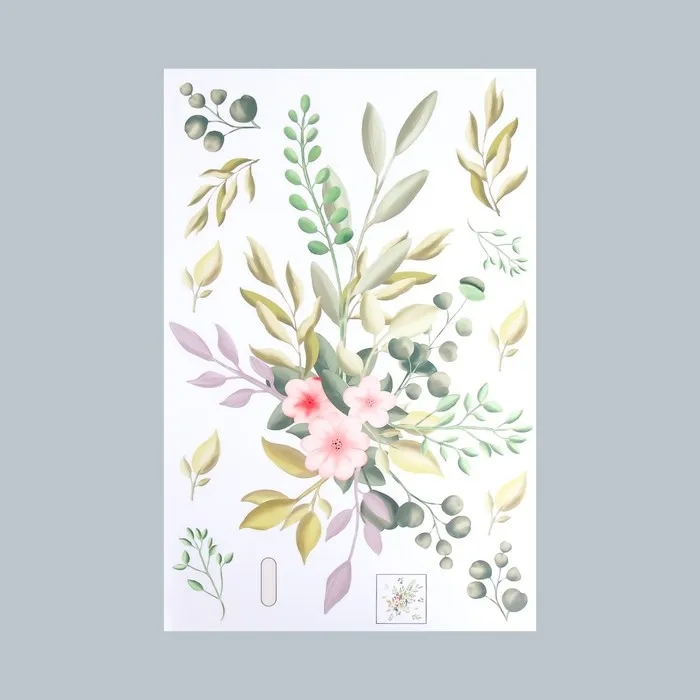 Наклейка пластик интерьерная цветная "Композиция зелень с розовыми цветами" 30х45 см