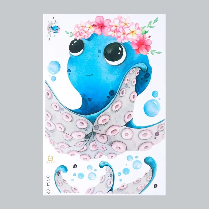Наклейка пластик интерьерная цветная "Осьминожка в цветочном веночке" 40х60 см