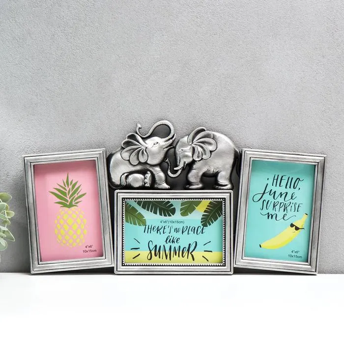 Фоторамка пластик на 3 фото 10х15 см "Два слона" тёмное серебро 22х43х2 см