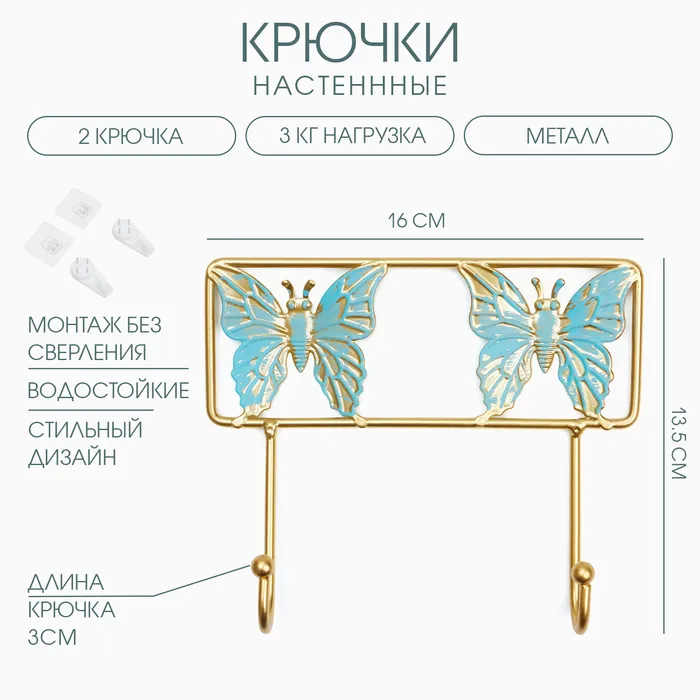 Крючки настенные декоративные TAKE IT EASY «Бабочки», 13.5×16×3 см, нагрузка до 3 кг
