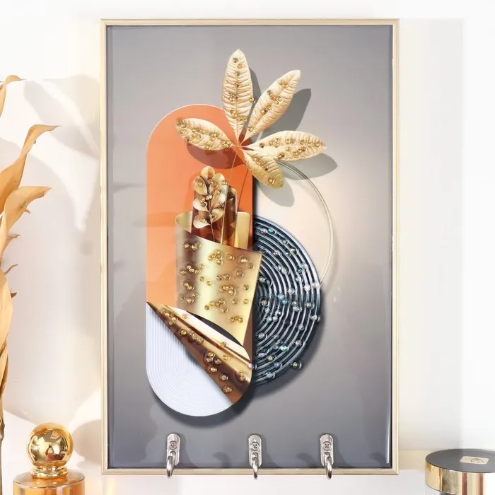 Ключница пластик, МДФ 3 крючка "Абстракция. Ваза с цветами" стразы, золото 29х1,8х19 см