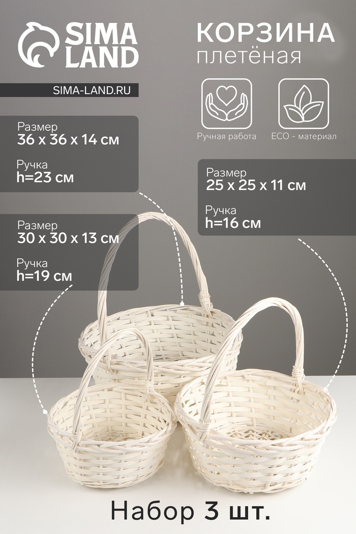 Набор корзин плетёных, 3 шт., 36×36×14 см, 30×30×13 см, 25×25×11 см, ива, белая