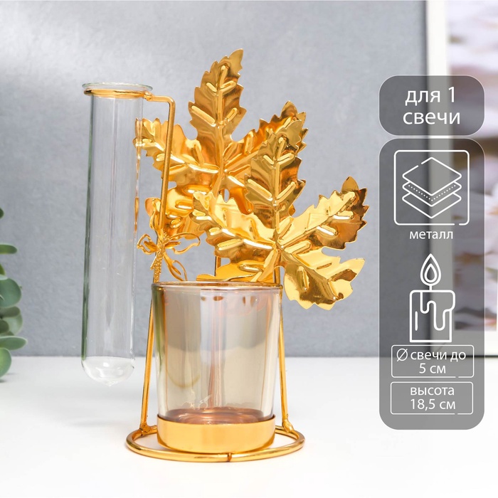 Подсвечник на 1 свечу с вазой-колбой для цветка, сухоцвета «Золотые листья», d=5 см, 7.5×14×18.5 см