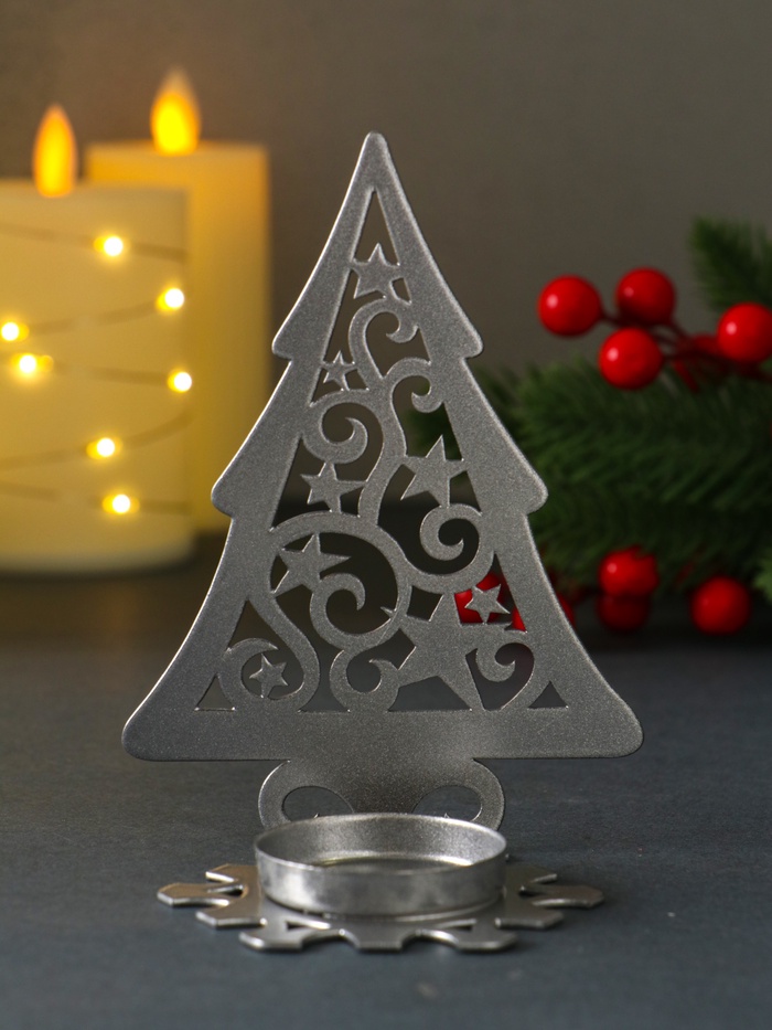 Подсвечник новогодний "Ёлка со звёздами" серебряный 6,6х9х12,5 см