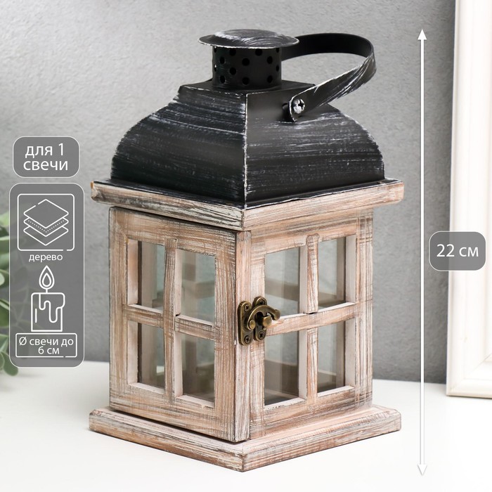 Деревянный подсвечник - фонарь на 1 свечу «Окошки», состаренный белый, 22×11.5×11.5 см
