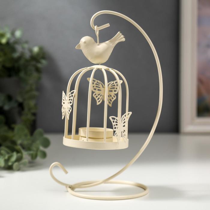 Металлический подсвечник-фонарь на 1 свечу «Клетка с птичкой», белая, 23×10×10 см