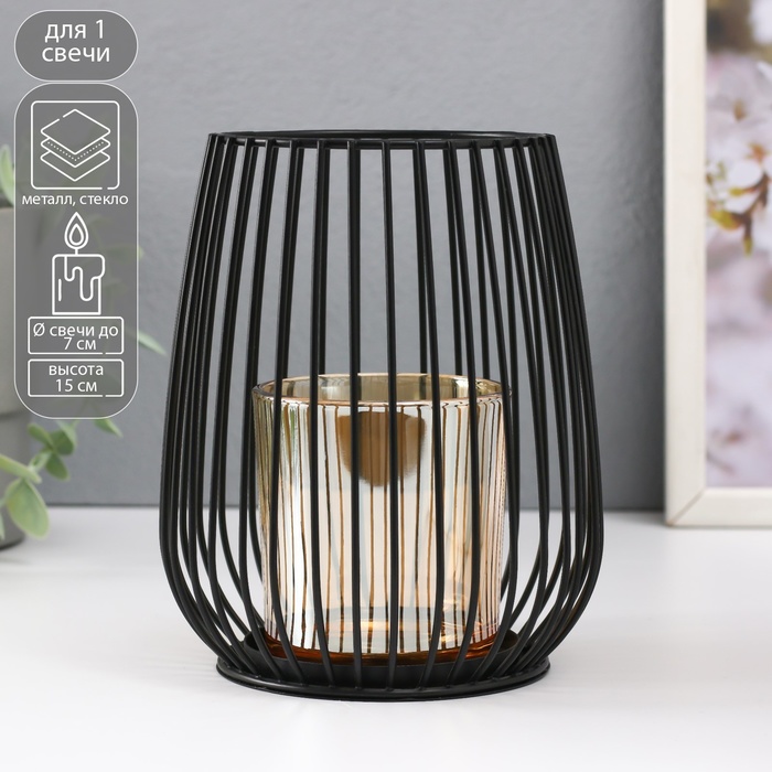Подсвечник металл, стекло на 1 свечу "Корзина с закруглёнными углами" чёрный 15х12,5х12,5 см 54140