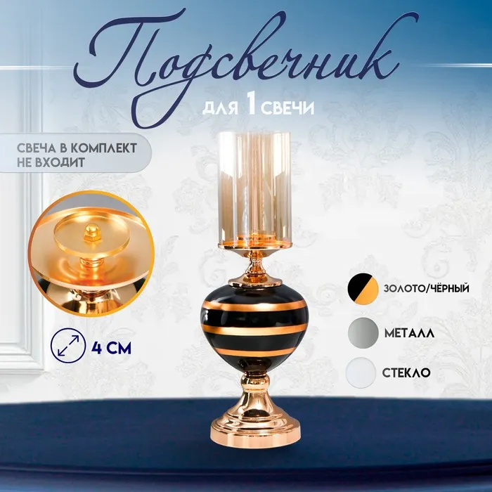 Подсвечник металл, стекло на 1 свечу "Мираж" золото с чёрным 42х17х17 см