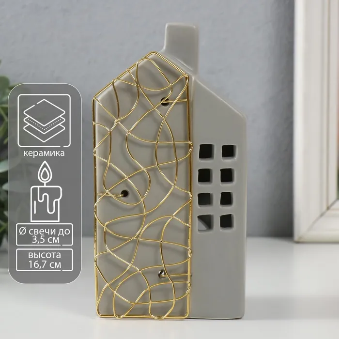 Подсвечник на 1 свечу «Дом», керамика, металл, серый с золотом, 9×6.3×16.7 см