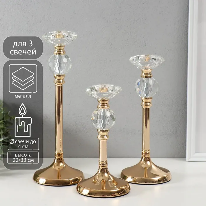 Подсвечник металл, стекло на 1 свечу «Оливия», d=4 см, набор 3 шт., h=33 см, 27 см, 22 см