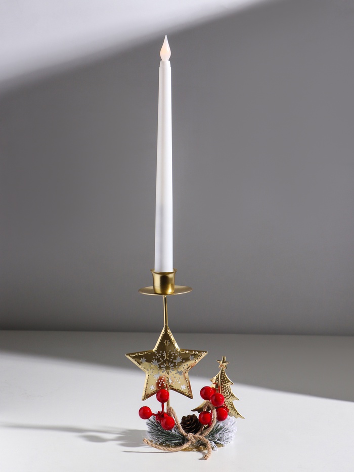 Подсвечник металл на 1 свечу "Звезда и ель с новогод.декором" золото d=2,5 см 12,5х9х18,5 см 10874