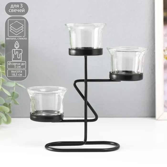 Подсвечник металл, стекло на 3 свечи "Кривая линия" d=2-5 см чёрный 16х6х18,5 см