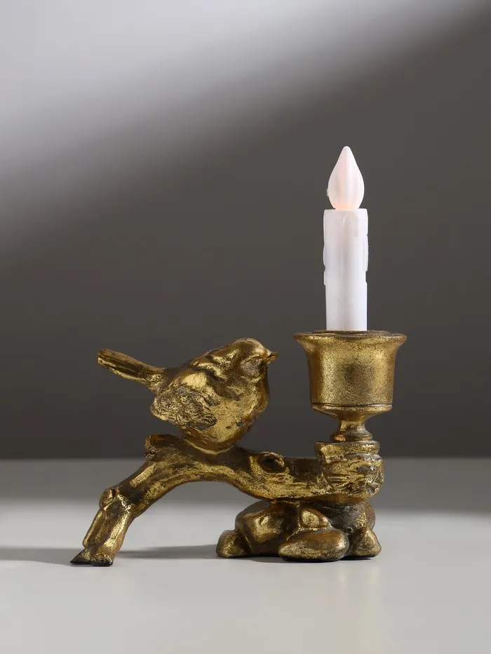 Подсвечник на 1 свечу «Воробышек на коряге», полистоун, состаренное золото, 14×6.5×8.8 см