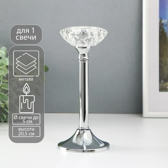 Подсвечник металл, стекло на 1 свечу «Кристальная чаша», d=5 см, серебро, 9×9×20.5 см