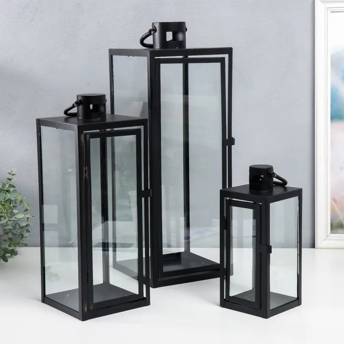 Подсвечник металл "Фонарь - минимализм" набор 3 шт чёрный 18х18х50, 14х14х39, 10х10х25 см