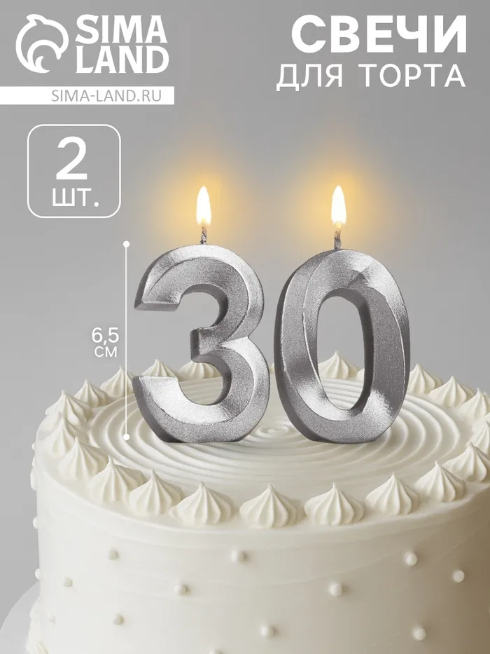 Свеча в торт юбилейная «Грань» (набор 2 в 1), цифра 30, серебряный металлик, 6.5 см