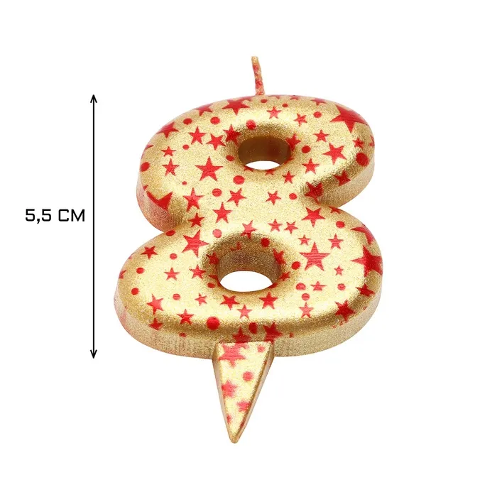 Свеча в торт «Саната», цифра 8, золотая с красными звездами, 5.5 см