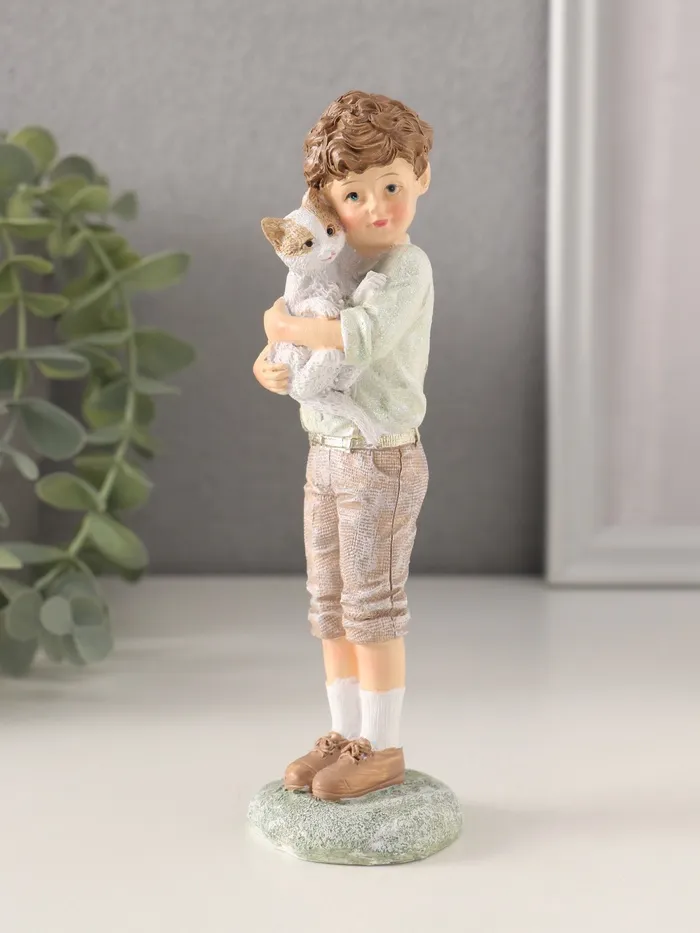 Фигурка полистоун «Мальчишка с котёнком», розово-зелёный, 5×4.5×16 см