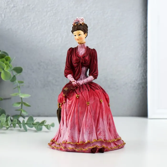 Сувенир полистоун "Мадмуазель в бордовом платье, с сумочкой, сидит на стуле" 13,5х12,5х21 см 98380