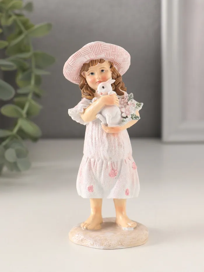 Фигурка полистоун «Девочка с кроликом и цветами, в шляпке», розовый, 5×4.5×12 см