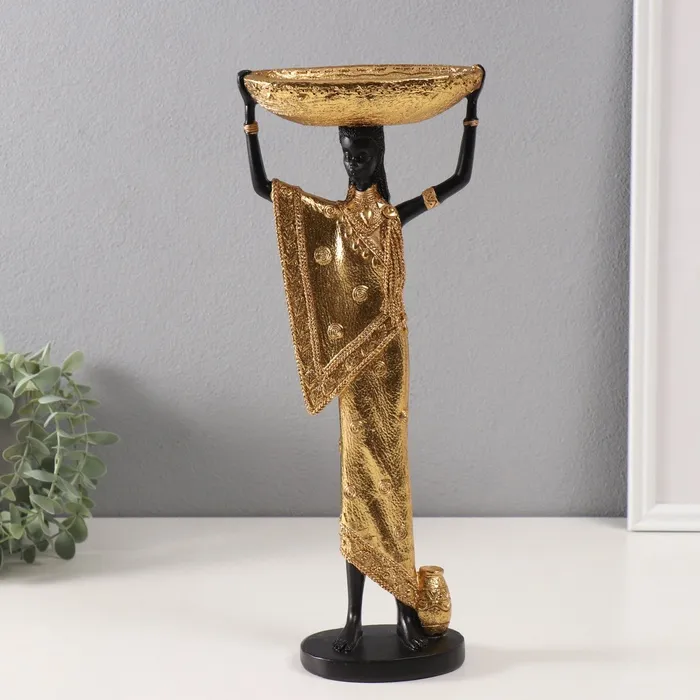 Сувенир полистоун подставка "Африканка Зэмба в золотом одеянии с чашей на голове" 8х15х37 см 10686