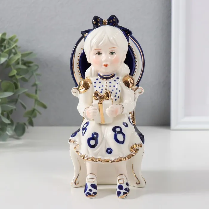 Сувенир керамика "Девочка сидит в кресле с подарком в руках" кобальт 7,5х10х17 см