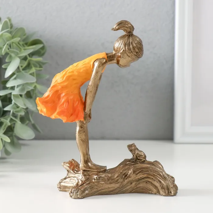 Сувенир полистоун "Малышка и лягушонок" бронза, оранжевый 12х5х15 см