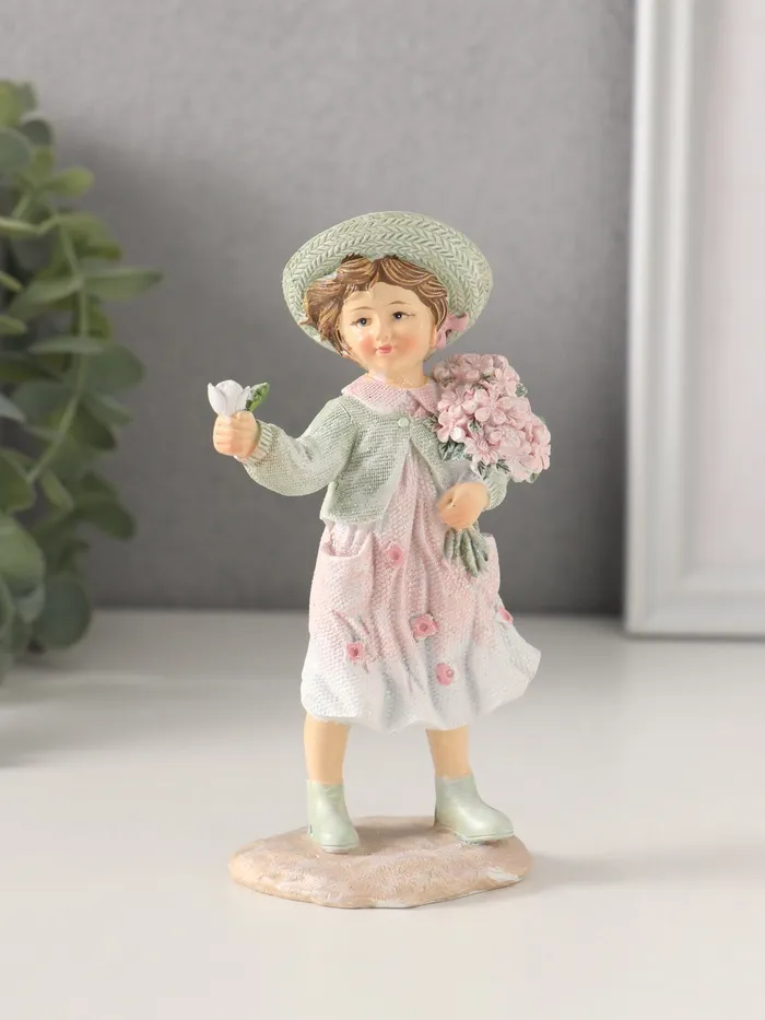 Фигурка «Девочка с букетом ромашек, в шляпке», полистоун, розово-зелёный, 6.5×4×12.5 см