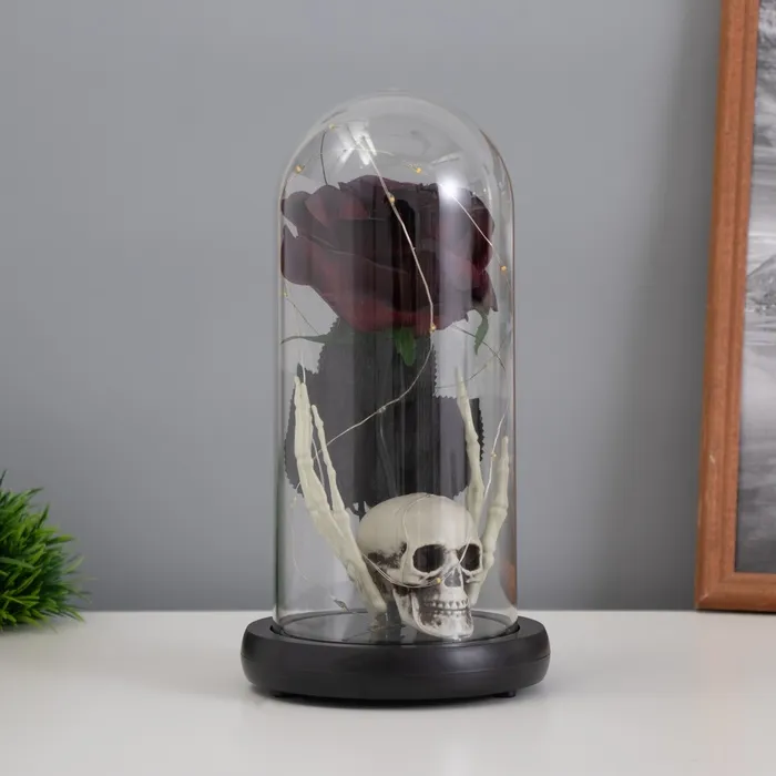 Фигурка светящаяся колба RISALUX «Череп с розой», LED-ночник, 1.5 Вт, 3×AAA, чёрный, USB, 11×11×21 см