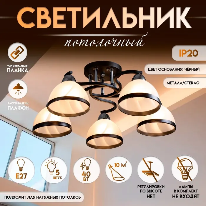 Светильник потолочный BayerLux «Ариса», 5×Е27, 40 Вт, чёрный, 56×56×22 см