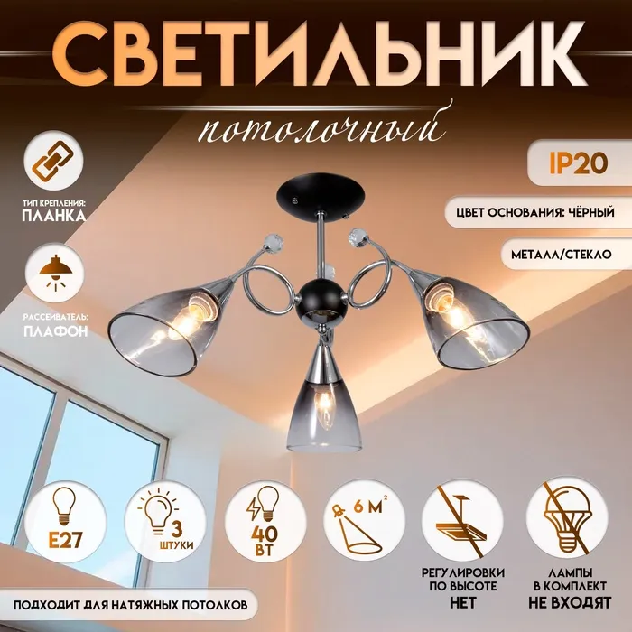 Светильник потолочный BayerLux «Клео», 3×Е27 40 Вт, чёрный, 58×58×24 см