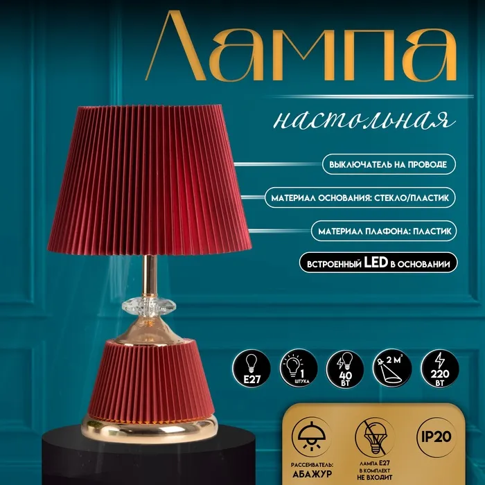 Настольная лампа с абажуром RISALUX «Клаудия», 1×40 Вт, Е27+LED подсветка основания, бордовый/золото, 15×15×32.5 см