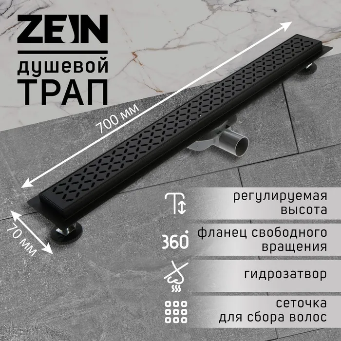 Трап ZEIN, c фланцем свободного вращения 360°, 7×70 см, d=40/50 мм, нерж. сталь, черный