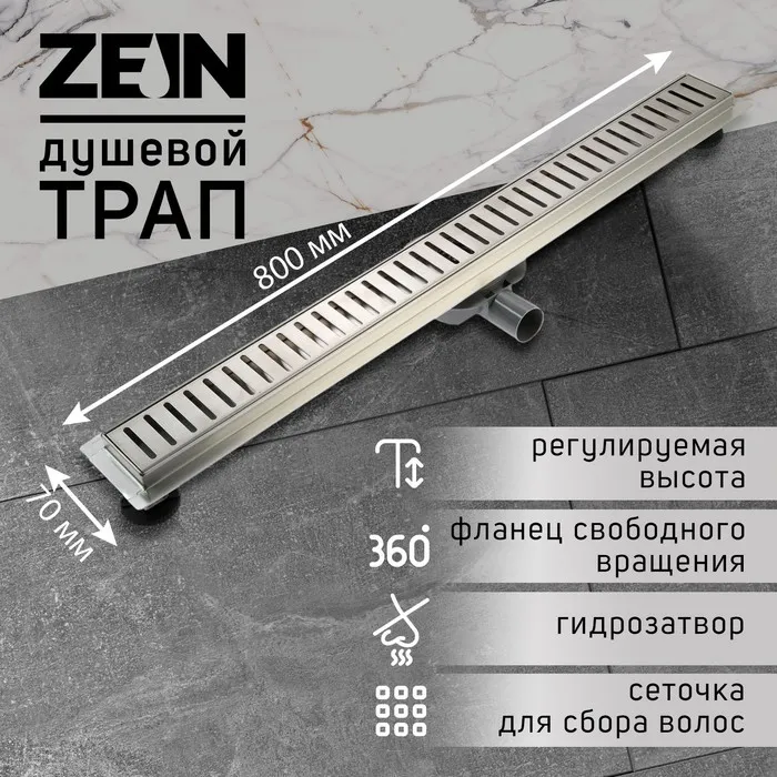Трап ZEIN, c фланцем свободного вращения 360°, 7×120 см, d=40/50 мм, нерж. сталь, сатин